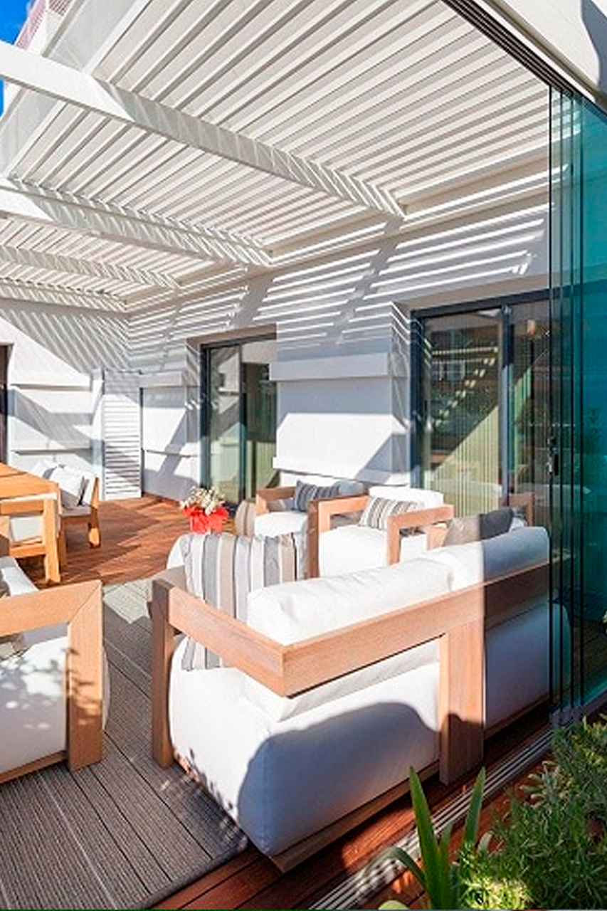 Las pérgolas bioclimáticas son estructuras exteriores de aluminio, provistas de una cobertura con lamas de protección solar.